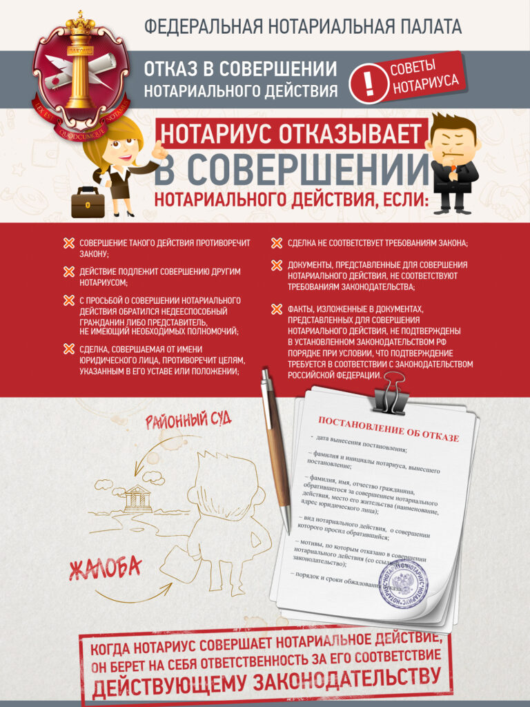 Когда нотариус совершает нотариальное действие, он берет на себя ответственность за его соответствие действующему законодательству. Нотариус имеет право отказать в совершении нотариального действия по основаниям, которые прописаны в статье 48 Основ законодательства Российской Федерации о нотариате.